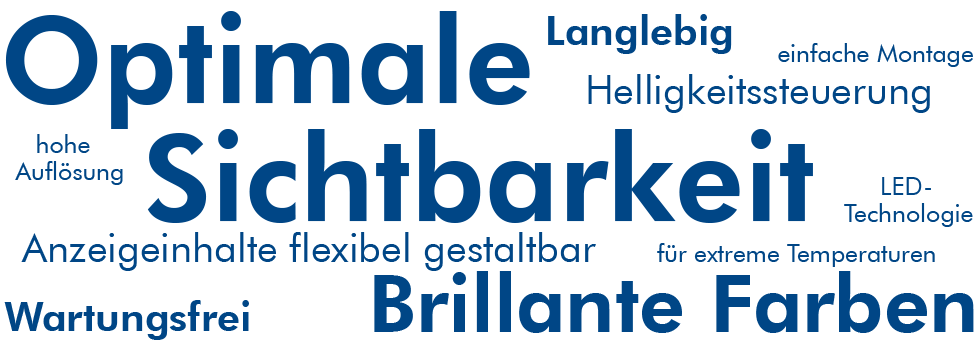 Unsere InnoScreen® LED-Anzeiger bieten, durch eine hohe maximale Helligkeit von bis zu 5.000 cd/m² und einen hohen Kontrast der LED-Module, eine optimale Sichtbarkeit im Außenbereich – auch bei Sonneneinstrahlung, Reflektion oder Nebel. Dabei kann die Helligkeit individuell auf den Einsatzstandort eingestellt werden und wird mit Hilfe von Helligkeitssensoren laufend automatisch an die Umgebungsbedingungen angepasst.